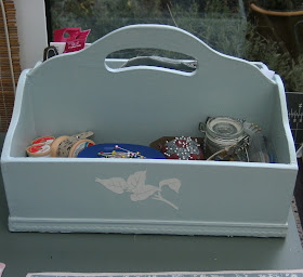 I popped in a local charity shop last Friday and bought a tatty looking box which as usual I forgot to take a "before" photo.  Painted it with Laura Ashley eggshell and cut out a leaf design from the Laura Ashley paper that I have just used in my bedroom.  Also lined the bottom with the paper.